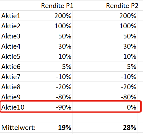 Nehmen wir an, die Prozente im Bild stellen die jährliche Entwicklung von Einzelaktien in einem Portfolio dar. Ein starkes Jahr. Im ersten Portfolio haben wir gleichgewichtet 10 Aktien gekauft und diese das Jahr laufen lassen. Bei Aktie10 waren wir uns schon beim Screenen nicht sicher, aber sie hat uns gefallen, in den sozialen Medien fanden sie alle gut, also Diamond-Hands! Auf dem gleichen Planeten in einer anderen Dimension hat der gleiche Investor gesagt - nachdem er dieses Playbook las - "nah, Aktie10 sieht schlecht aus, ich finde nichts anderes, ich lass das in Cash liegen". Die Aktie10 hat dem ersten Investor -90% beschert und er ist am Jahresende super zufrieden mit seinen 19% Rendite. Investor 2 hat verzichtet, war nicht mit im Boot, und hat 28% Rendite gemacht.