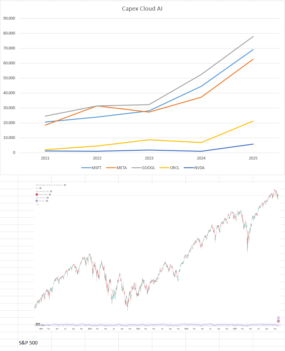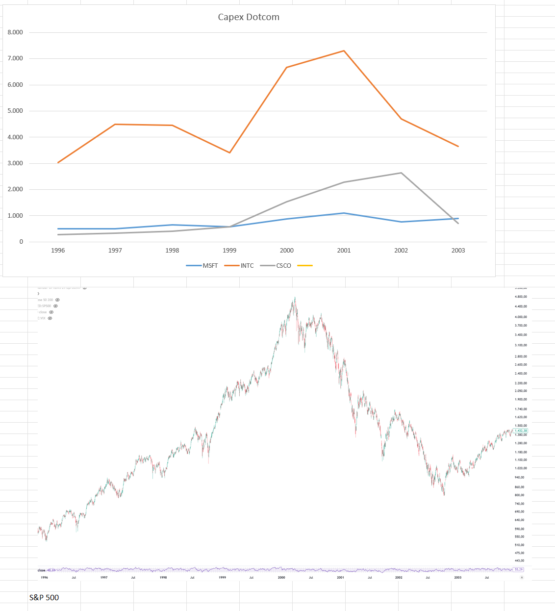 Leider habe ich kein Bloomberg-Terminal, um das zu veranschaulichen und die These stammt nicht von mir. Letztes Jahr wurde viel über die KI-Blase geredet. Michael Burry hat auf seinem Substack eine umfassende Abhandlung dazu geschrieben. Ist leider kostenpflichtig. Kern der These ist, dass, immer wenn die markttreibenden Unternehmen übermäßig viel investieren, das Zeichen eines Peaks vorhanden ist. Das Capex steigt dann eine Zeit weiter, während der Markt sich schon abwärts bewegt. Ich sehe das ähnlich. Ich habe die These von Burry geprüft und gebe nun meinen Senf dazu.