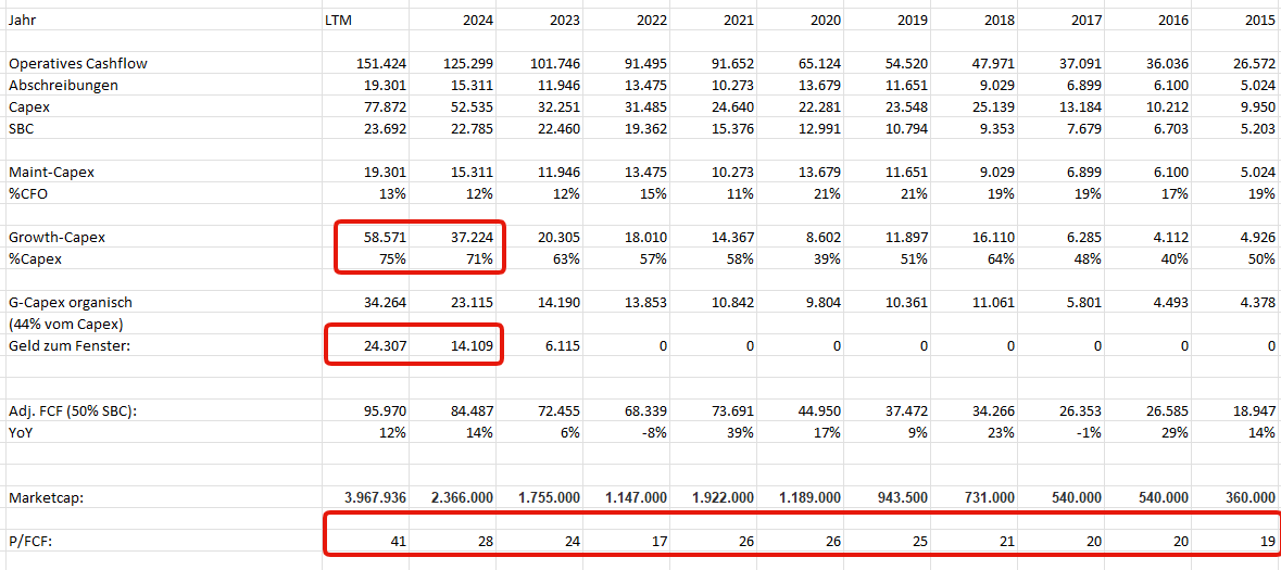 Growth-Capex = Capex - Abschreibungen. An den %-Zahlen darunter sieht man schon, dass das in den letzten Jahren in die Höhe schoss.