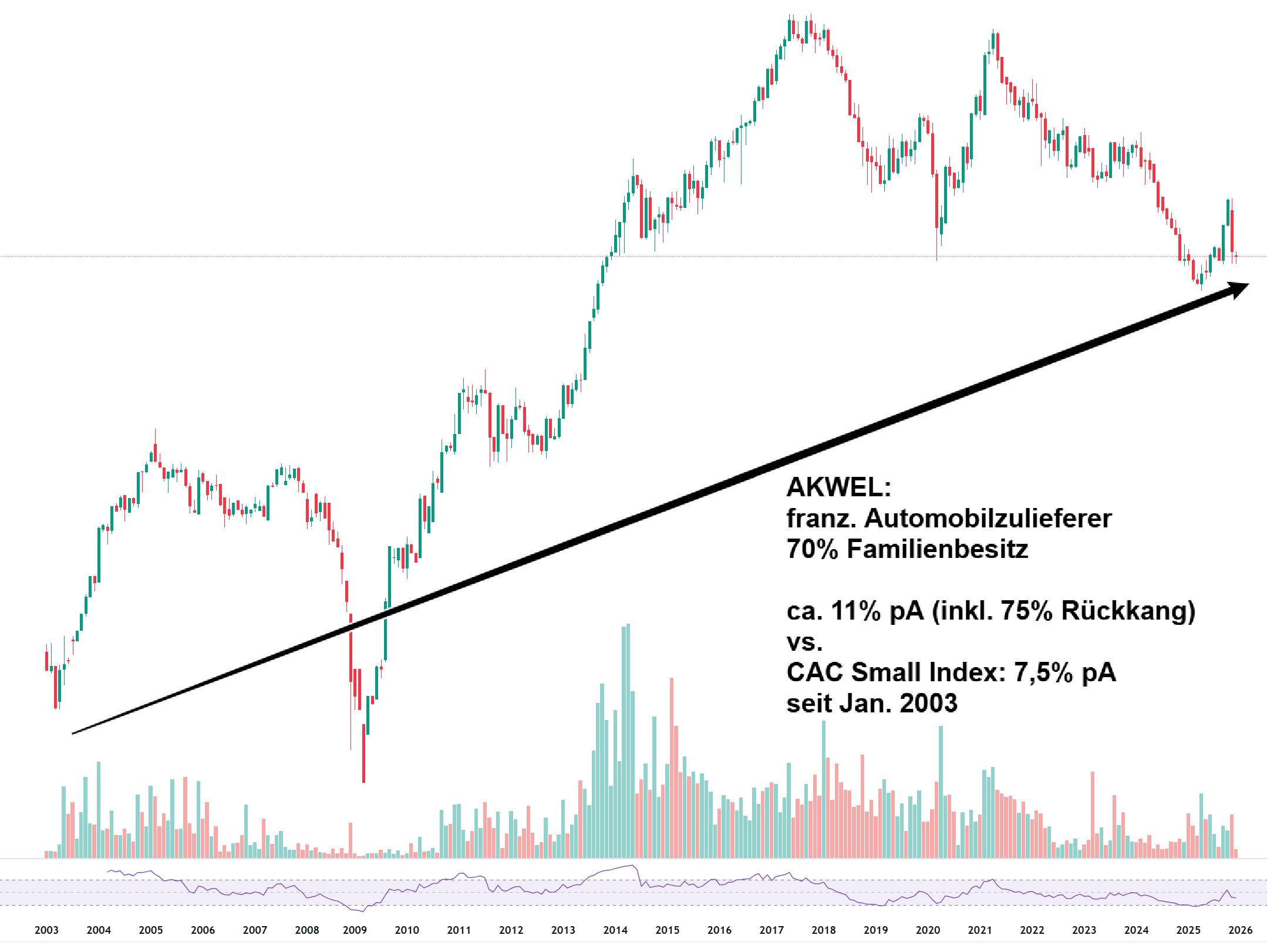 (AKWEL aus Frankreich, langfristig nicht schlecht für einen kleinen Autozulieferer, trotz 75% Einbruch aufgrund der makroökonomischen Problematik. Bis heute ein langfristig gutes Investment gewesen, was Peers und Index schlägt - Einfluss der Familie vielleicht?)