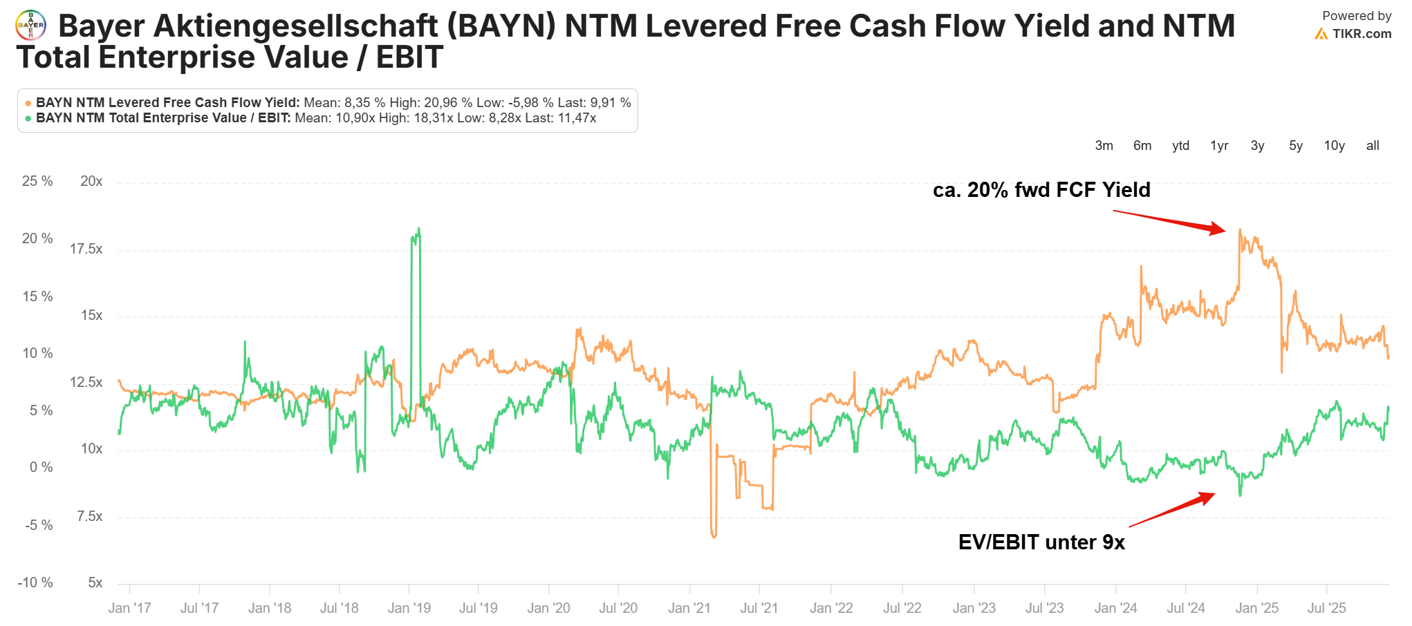 In dem Kontext ist es wichtig, dass man seine Hausaufgaben richtig macht. 20% FCF-Yield bedeutet, dass der Markt einpreist, dass sich der FCF halbiert. Dann investiert man in echt in ein schrumpfendes Asset mit 10% FCF-Yield. Deshalb ist Bewertung immer nur Teil des Ganzen. Im Idealfall trennt man aber Valuetraps von echten Valueplays und kann das Yield rel. schnell "einlocken". Außerdem sind niedrig bewertete Geschäfte auch weit riskanter als starke, wachsende Geschäftsmodelle. Nach der Effizienzmarkthypothese sind das dann die riskanteren Aktien, die mehr Rendite bringen - Ich hoffe, die Ironie dahinter kommt an.