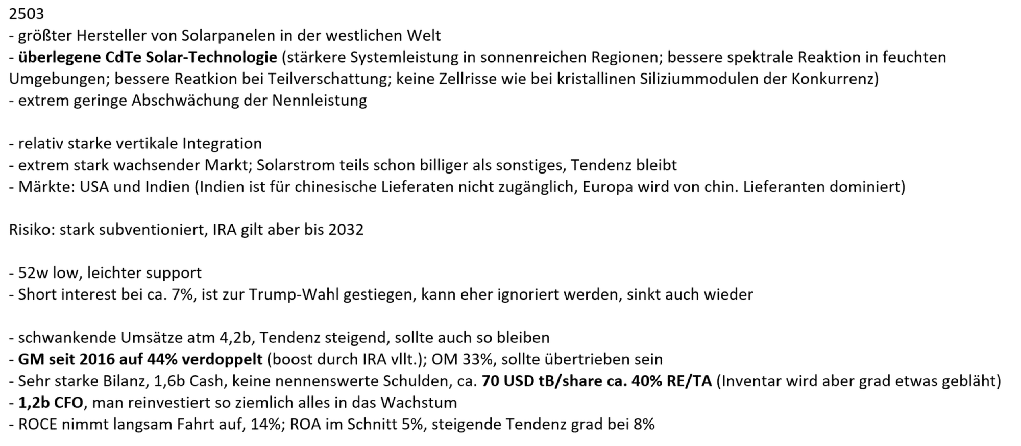 First Solar, März 2025 (wichtige Eckdaten - Preis pro Aktie; Marktkapitalisierung; Bewertung; wichtige Fundamentaldaten - gibt mir mein System wieder, wenn die nicht sofort griffbereit sind, gehören die in die These); der Titel stand bei ca. 120 USD und 13 Mrd. Marktkapitalisierung, als ich ihn bewertet habe: