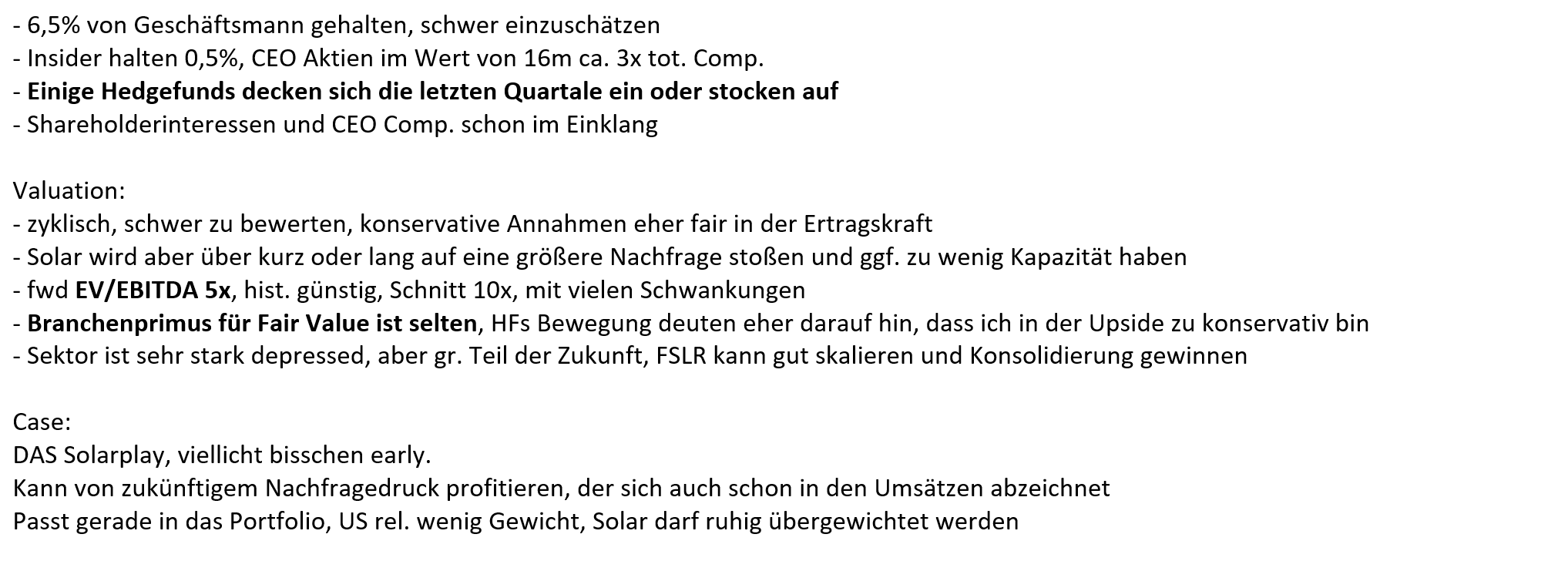 Ich verfasse zu jeder Investition eine kurze Investitionsthese. Innerhalb des Analyseprozesses sind einige Notizen angefallen, die es zu bündeln gilt. Ziel ist ein Text, der den Investitionsfall kurz erklärt. Ich löse das mit Stichpunkten. Hier ein Beispiel: