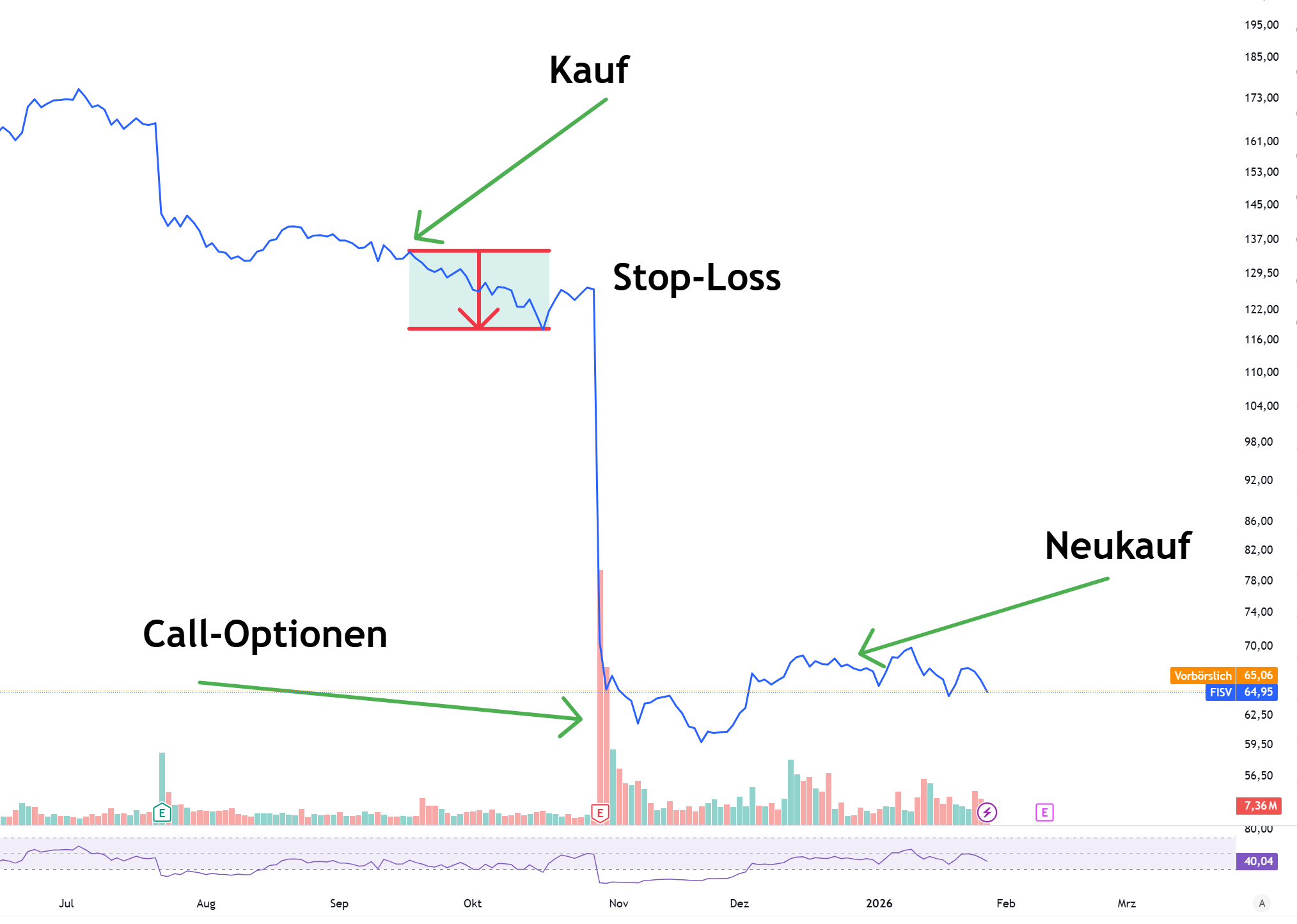 Ein etwas extremes Beispiel (Fiserv) verdeutlicht meinen Umgang mit Stop-Losses. Sie schützen manchmal vor krassen Fehleinschätzungen.