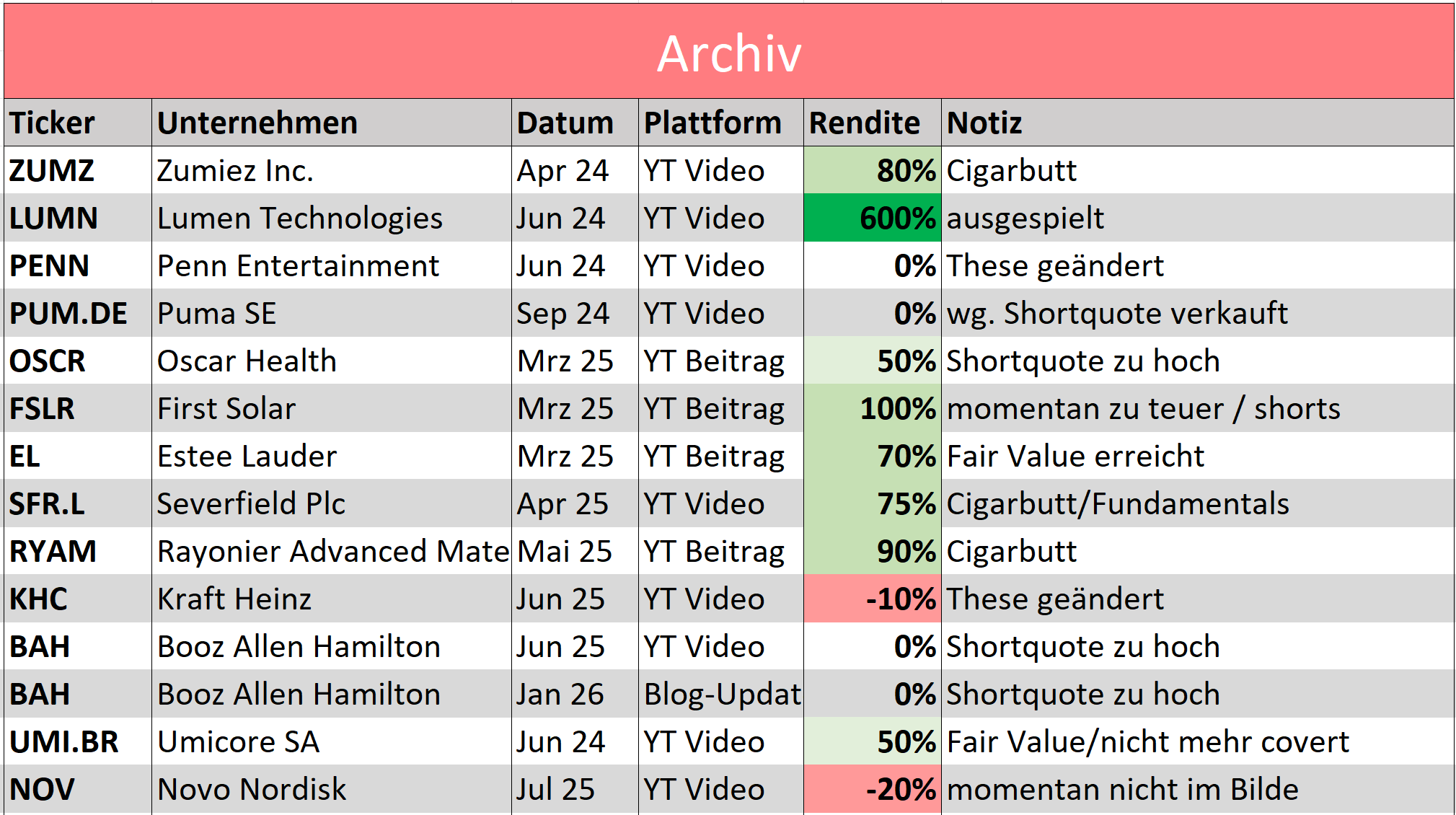 "Archiv": Situationen, die sich ausgespielt oder geändert haben. Die Investition ist sozusagen "abgeschlossen". Ich bin mit Augenmaß herangegangen und habe auch Währungsschwankungen mit einfließen lassen. Die Renditen stoppen mit dem Ende der These. Beispiel: Lumen wurde mit 600% Gewinn verkauft, danach ist der Fall zu Ende und wo die Aktie jetzt steht, ist irrelevant.